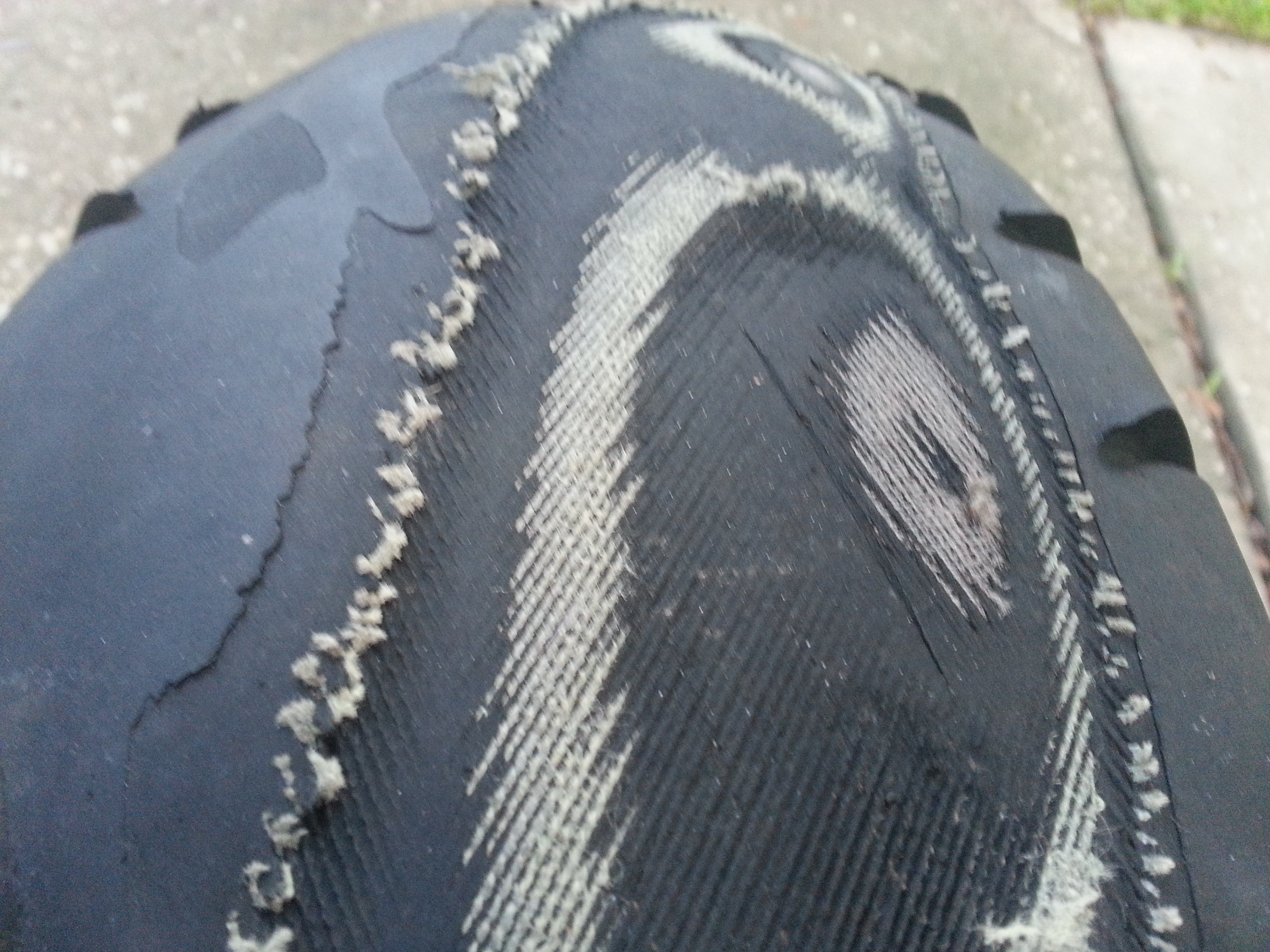 The following pictures show the back tire after 14,500 miles of touring the mountain roads Colorado. We clocked about 2500 miles in 7 days on that road trip. The severe wear showing the tire’s under-layments occurred in the last 500 miles in our final two days of riding. I inspected the tires two days before concluding our road trip and knew the back tire would need replacing soon. However, I didn’t notice the severe wear pictured until we had completed our trip and already garaged the bike. Needless to say, my lesson learned is to inspect tires daily prior to riding. Thankfully we made it home without incident.